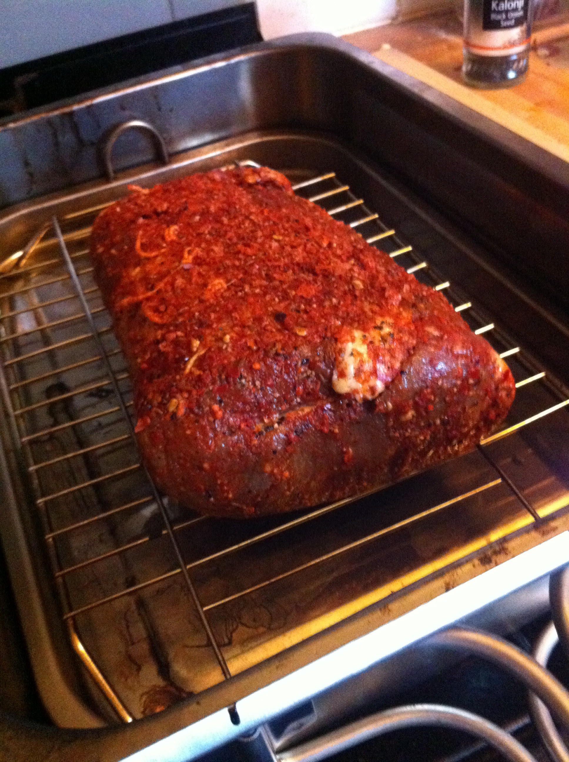 Pastirma is a Turkish dry-cured beef, similar to bresaola, but coated in a clay-like spice paste for the final stage of the curing process. Here, the same spices are turned into a barbecue dry-rub.