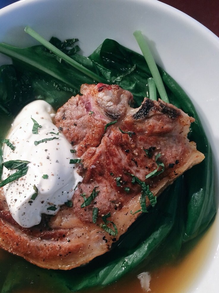 Pink, seared lamb, wilted ramson leaves, rich, seasoned yoghurt. Serves as many as you like.