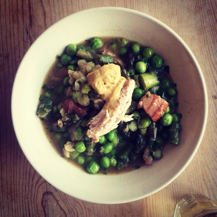 Arrange the rabbit pieces nicely on top (they’d better fit) and add a couple of ladles of that veg stock, which should be ready by now – enough to not-quite-cover the rabbit, bring to the boil, simmer for twenty minutes. Meanwhile, slice the asparagus into pea-ish sized bits. When the twenty minutes are up, add the peas and asparagus, cover with a lid and simmer for ten minutes more. Finely chop the parsley with the lemon and stir in. A swirl of cream would be appropriate, and some extra mustard is a good idea.