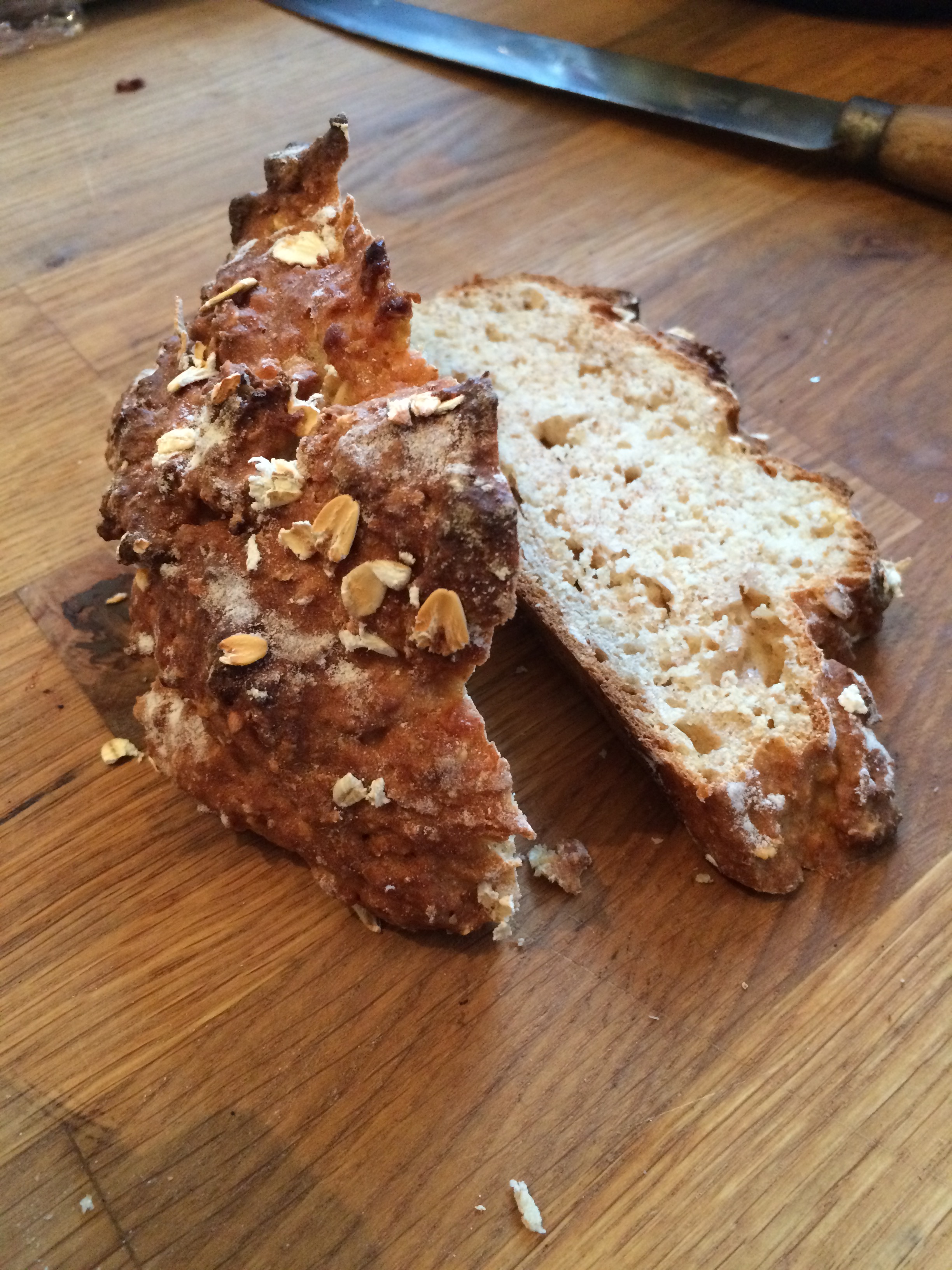 Form into a rough ball, and flump this onto a floured baking tray. Sprinkle with oats and a little flour, then cut a deep cross in the loaf (like, halfway through deep). Rest for another ten minutes, then bake for 30-35 minutes -like most bread, it’s done when it’s good and brown and sounds hollow when you tap it on the bottom.